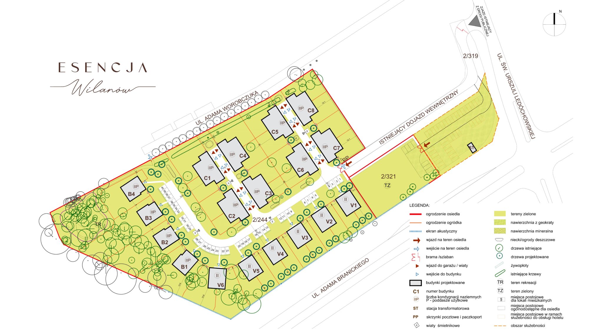 Wilanów to codzienny komfort: zieleń, spokój i bliskość miasta. Esencja Wilanów powstaje w kameralnej części dzielnicy, przy ul. Św. Urszuli Ledóchowskiej i ul. Adama Worobczuka. Zieleń urządzona, leśny zakątek rekreacyjny i uporządkowana przestrzeń osiedla sprzyjają odpoczynkowi po intensywnym dniu. Wewnętrzny układ dróg, paczkoport przy wjeździe oraz ekran akustyczny od strony ulicy Branickiego sprawiają, że życie jest tu wygodne i spokojne. To miejsce, do którego chce się wracać — każdego dnia.