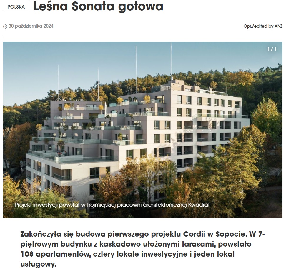 Zakończyła się budowa pierwszego projektu Cordii w Sopocie. W 7-piętrowym budynku z kaskadowo ułożonymi tarasami, powstało 108 apartamentów, cztery lokale inwestycyjne i jeden lokal usługowy. Osiedle znajduje się na Przylesiu, nieopodal Trójmiejskiego Parku Krajobrazowego. Inwestycja zawdzięcza swoją nazwę słynnej Operze Leśnej, do której można dojść w trakcie kilkuminutowego spaceru.
